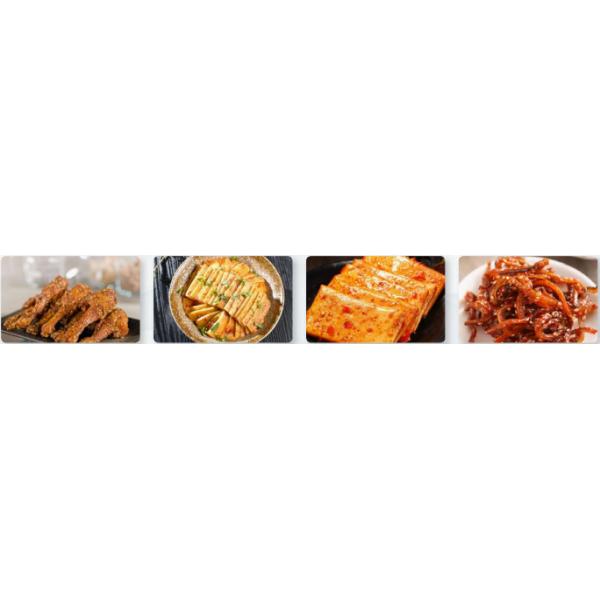 cannot be automatically metered and need to be manually placed, for example, strips of dried bean curd, duck neck, duck feet, duck wings, and marinated eggs. The vacuum machine is equipped with a telescopic measuring cup mainly for bulk materials. and the products are measured by the volume of the measuring cup, for example, spicy snacks of bean products, spicy dried bean curd, pickles, mustard, sauerkraut and the like.