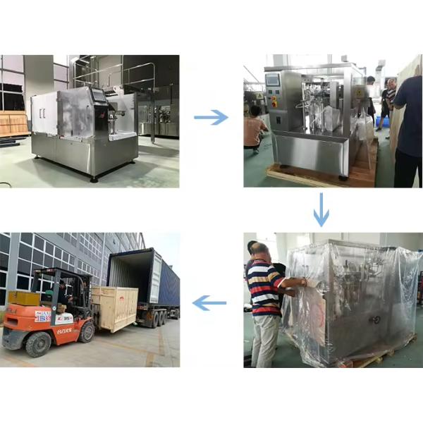 HIGH-SPEED PRE-MADE POUCH VACUUM MACHINE WITH ROTATING CUPS SYSTEM is shipped in sturdy cardboard boxes for secure transport . The box is safe from weather , dust , and other external factors that could damage the product . The product is also wrapped in protective plastic , foam , or other materials to cushion the product from shocks and vibrations during transit.The box also contains instructions for use and other necessary paperwork.